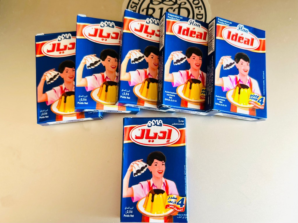 Now this. It’s impressive, in many ways. Its package design has a giant flan, and Ms. Japan in a traditional Kimono, and 1dhm for a box (and makes 4 servings). Amazing. This flan mix has a competitor – clearly, a Moroccan lady. Ms. Ideal. Now, Ms. Ideal comes in 6 packs for 7 dhm (when I purchased). Well… She is on peu special etelle est optimiste, comparing to our Madame Butterfly-ish Ms. Japan, I guess.