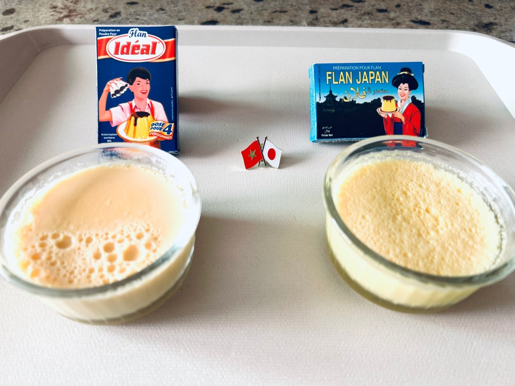 Result? EXACTLY THE SAME. 🍮 Exactement les mêmes. Both were Bnina Bzaaf (very yummy)! I enjoyed decorating the flan as well 🙂 両方全く同じお味で😅でも美味しかったです。コスパよし!デコレーションするのも楽しい、なプリンちゃん達でした。