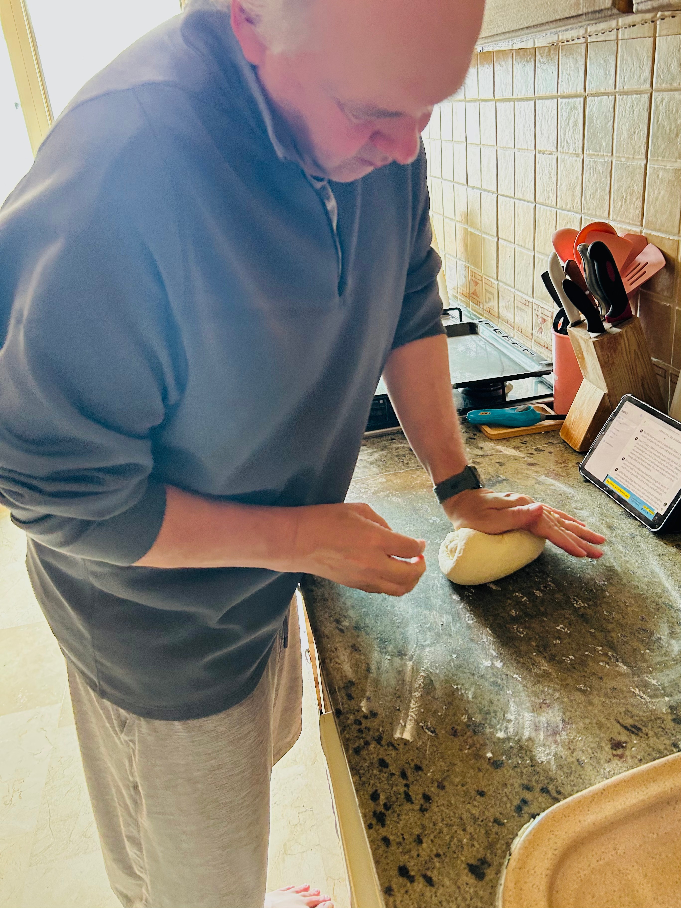 こねあげなんですが、15分はやった方がいいと。ここはですね、オオラフ先生に最後の5分だけご登場願いました。というのも、私は「パンをこねる」というのに自信がないのですが、彼は、MIT時代に<LOAF (パン)🍞>というあだ名さえ付いていたくらい、パン焼き名人!なので、ここはちょっとだけ、プロの手を拝借です👨🏻🍳。パンの生地をこねるのって楽しいですよね。なんだか白雪姫になった気分になります。小鳥さんやリスさんが来て歌ってくれそうです🎶。