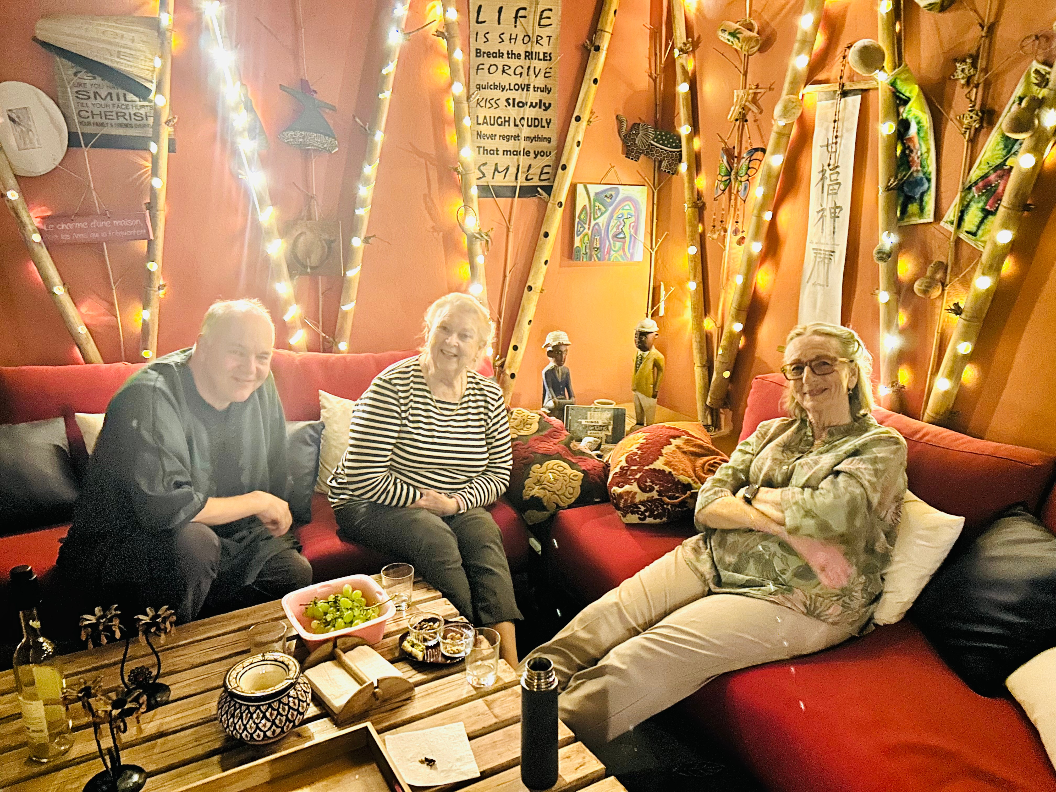* Having Rose Hip Soup and Lingonberry drinks🍹 (also brought from Sweden) in Morocco – with a twist.🌪 スウェーデンから持って来てくれたローズヒップ·スープやリンゴンベリー·ジュースを<大人流にアレンジ>して楽しむ3人😎。