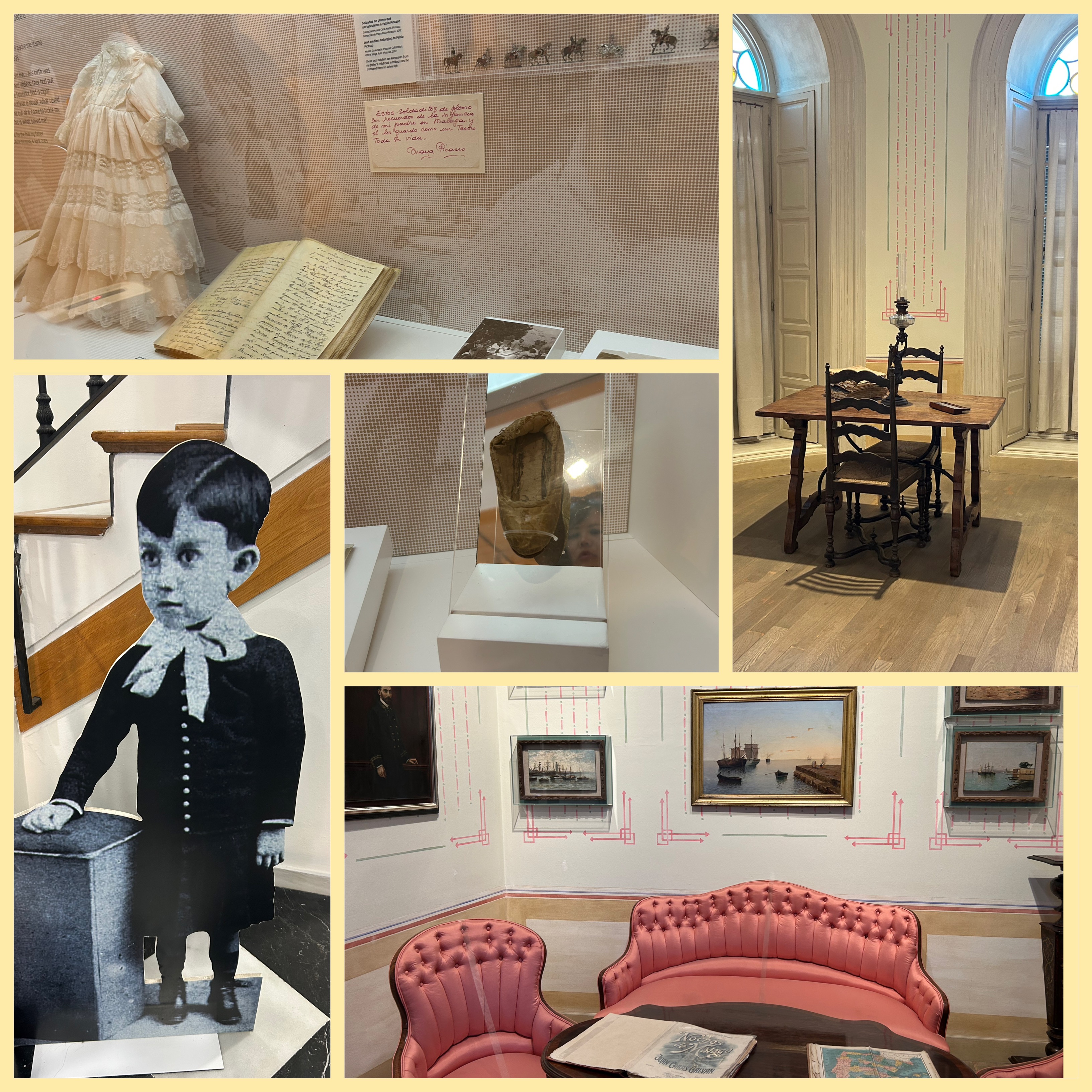 ピカソの絵に頻繁に使われる「鳩」は、実はお父さんが大好きだった鳥。世界平和のためのポスターに描かれた事は有名ですが、自宅に鳩舎を作ったり、愛娘に”パロマ”と名付けたり、と、鳩さんへの愛情は深そうです。そうそう、パロマさんとご主人、現在マラケシュにお住まいだそうです😘。うふふ、ご近所さん!そしてこれまたピカソと言えば、の闘牛。こちらも幼少期に親子で楽しんだアクテビティのひとつだったとか。博物館でみたこのマント。マドリードの老舗ブランド、Sesena社のデザイン。まるで闘牛士のようなピカソさん。晩年はさまざまな理由によりスペインを離れていたけれど、やはり心も体も、スペインの血が流れ、そして、いつまでもお父さんの事を思っていたんでしょうね。そんなマエストロ、棺の中でこのマントを着て永眠されているそうです。