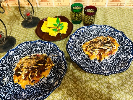 My husband’s speciality: Okonomiyaki! It’s so yummy 🙂 旦那さんは、すっごく美味しいお好み焼きを作ってくれたりします~。