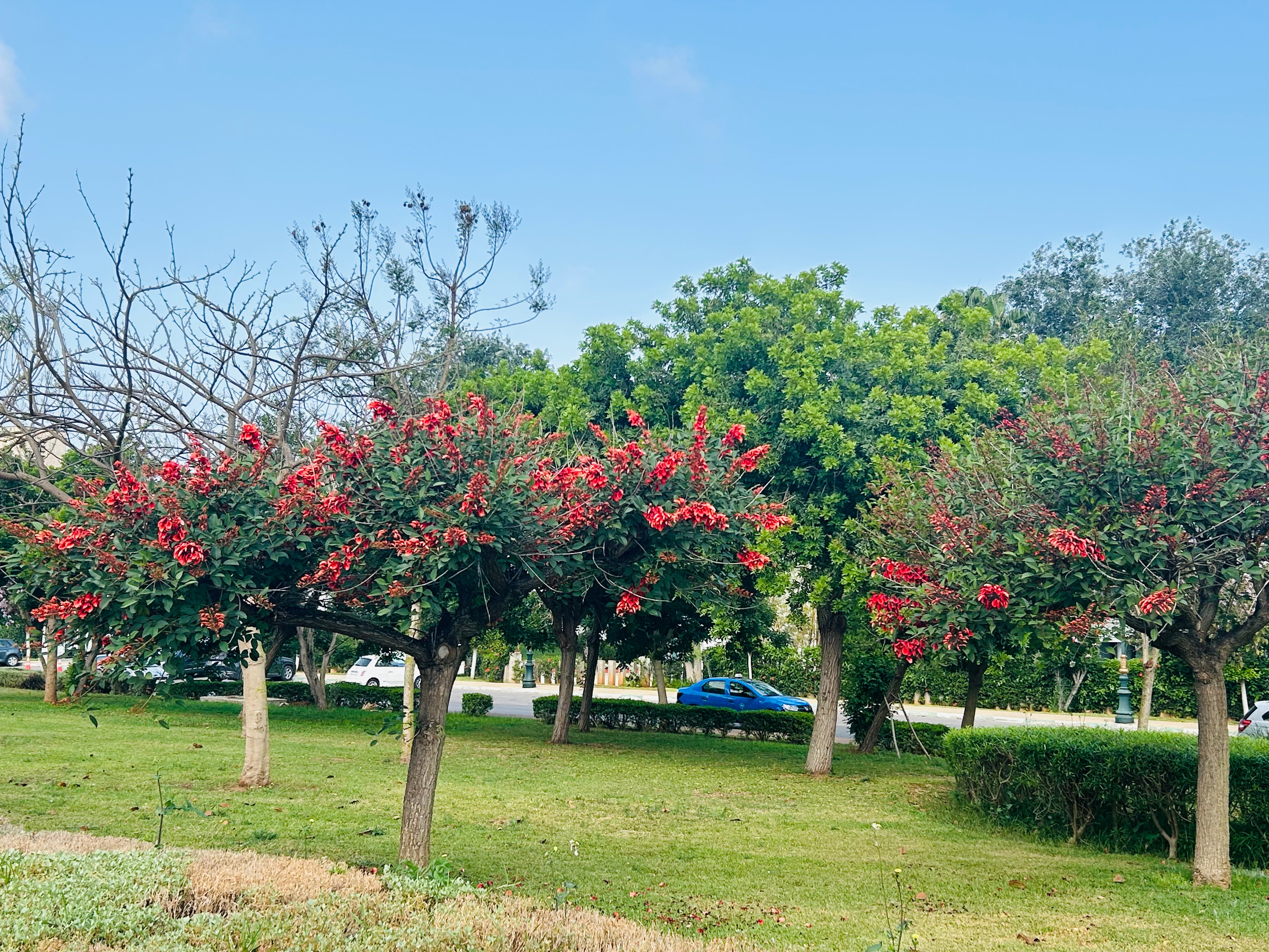 まずは、この真っ赤なお花の木。こちらCockspour Coral Tree, 日本語名は「アメリカディゴ」というらしい。このお花、なかなかユニークな形をしていますが、これがニワトリの足にある蹴爪ににている(Cockspour)ということらしいんですね。