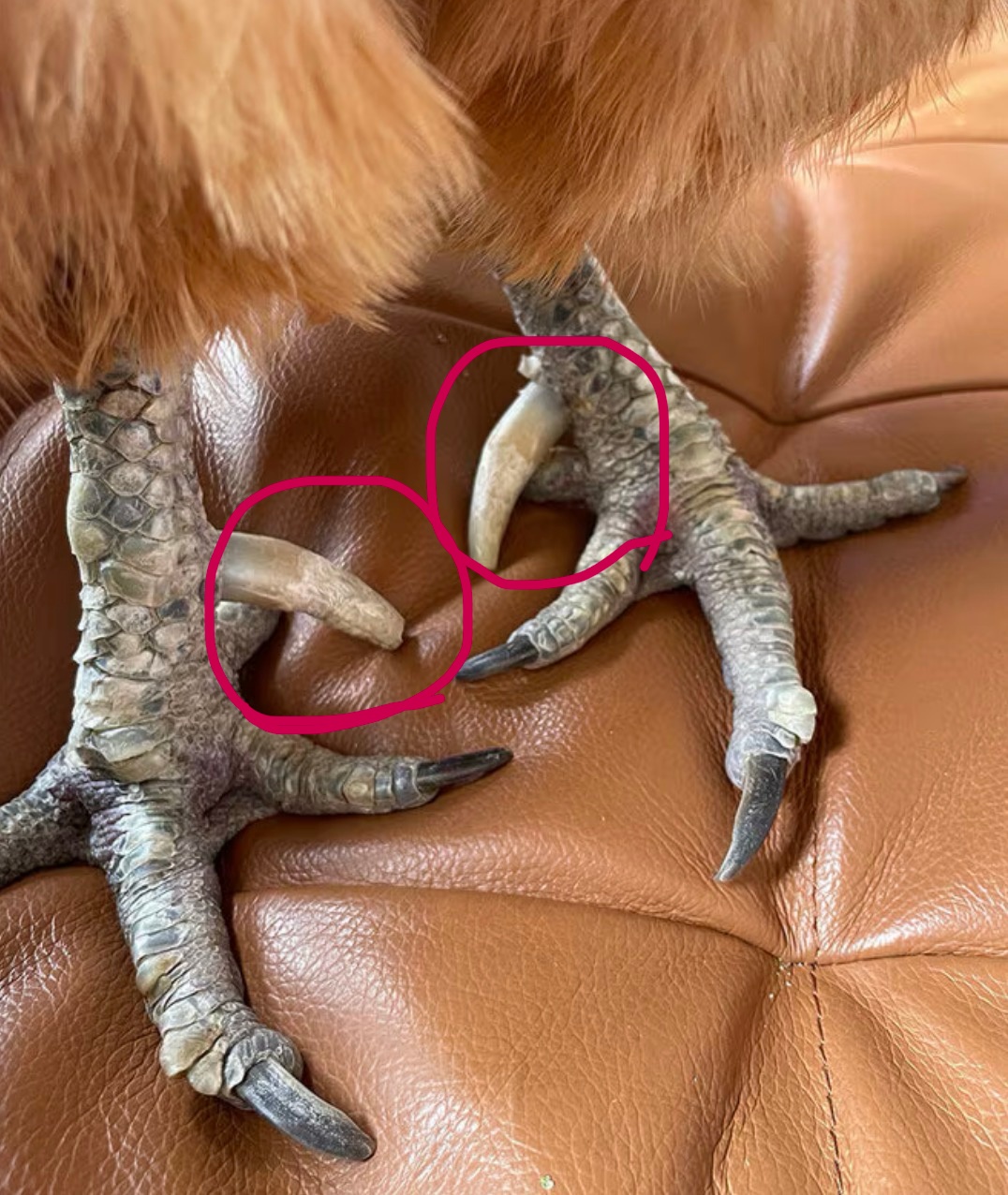 気になったのでニワトリさんの足をズームでみてみます。この後ろ足部分にヒョコンととんがってでている、これだそうです。赤くはないけど、ふむふむ、形は確かに似ています。