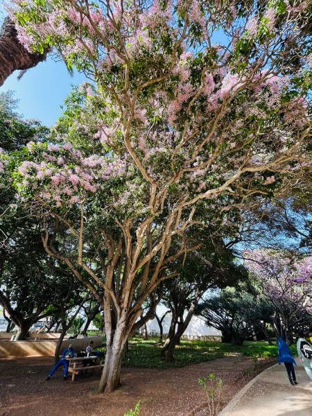 この美しい花でいっぱいの木は、Cape Chestnut Tree、日本語名は「カロデンドラム·カペンセ」らしいのですが、日本語っぽくないので、ケープ·チェストナッツでいいのかな。名前に「栗」が入っていますが、実は栗科の木ではないそうです。甘い蜜があるらしく、蝶々や蛾、蜂がたくさん集まってきておりました。