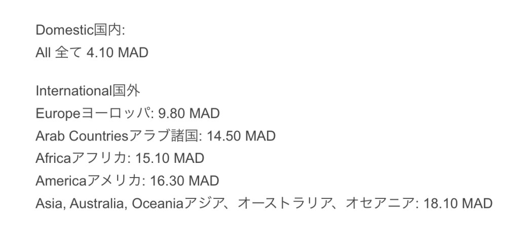 郵便局の優しいお兄ちゃんに教わった通り、アメリカへ送るための絵葉書に4.10MADの切手を2枚、そして、9.80MADの切手を1枚貼って送りました。「ハガキ郵送はきっと世界共通だよね!」と勝手に理解して、日本の両親にも同じように送ってしまった後にこのような事実を知り、、、